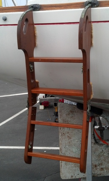 Marionette's swim ladder - Marionette has no stern rail so a fixed ladder seemed problematic at the time. She has a light weight, very functional, swim ladder that folds for storing under the cockpit, and in use is easily moved to different places along the toe rail. It is aluminum, with wood steps, white plastic handle guards, white rubber tipped hull offsets, and homemade pads on the deck surface end. I really like this ladder.