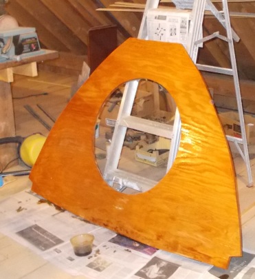 It was initially a single piece but that did not fit through the hatch. Small wood wedges along the floor press the bulkhead upwards and close the gap to the cabin roof; these will be made strong with plastic furniture wedges and the bulkhead will be fiberglass tabbed into place.